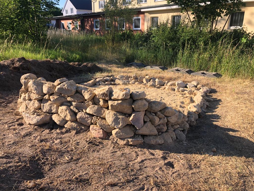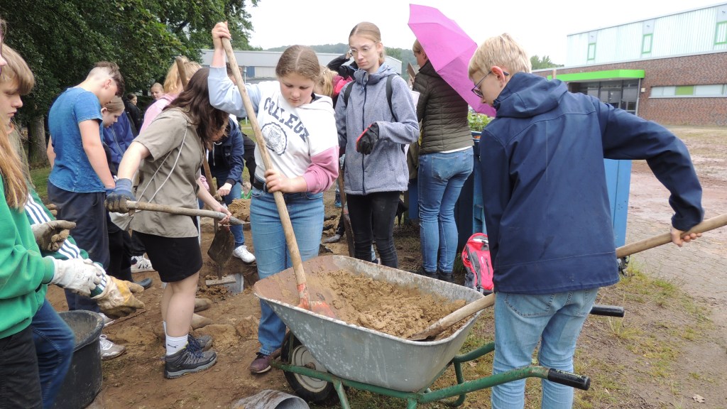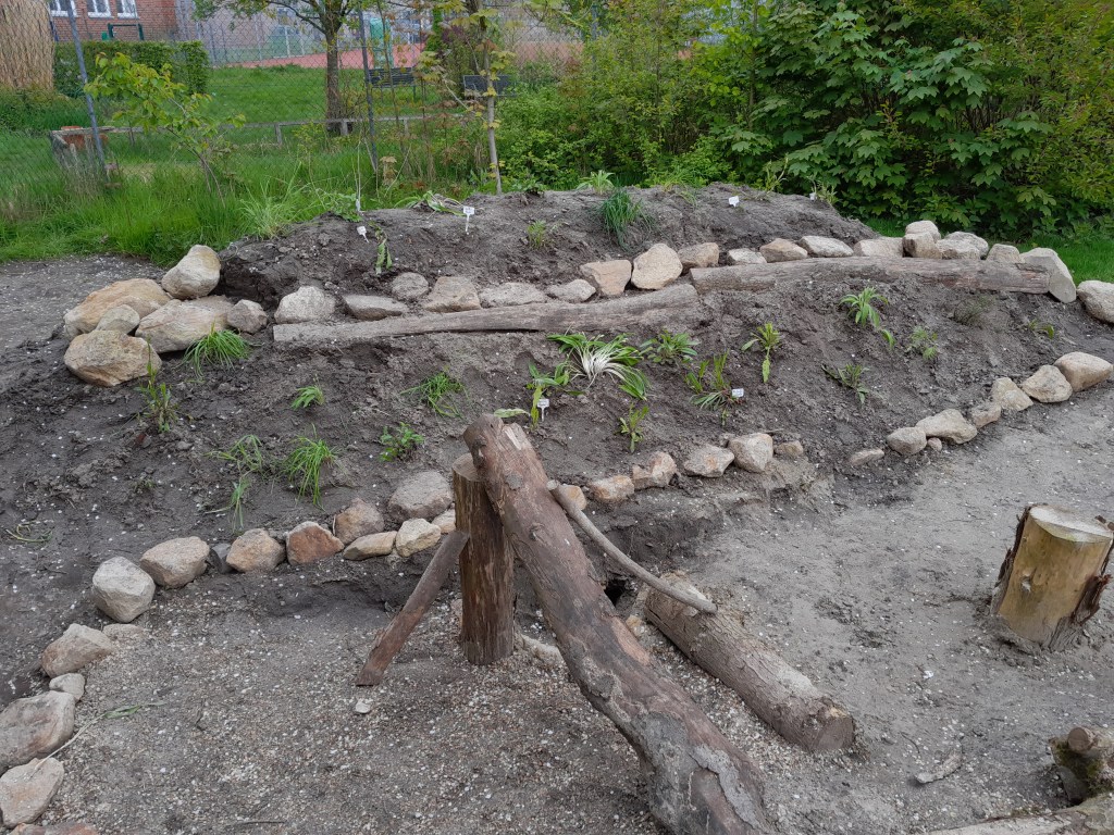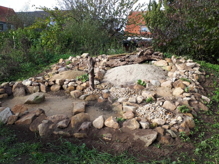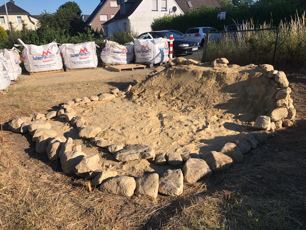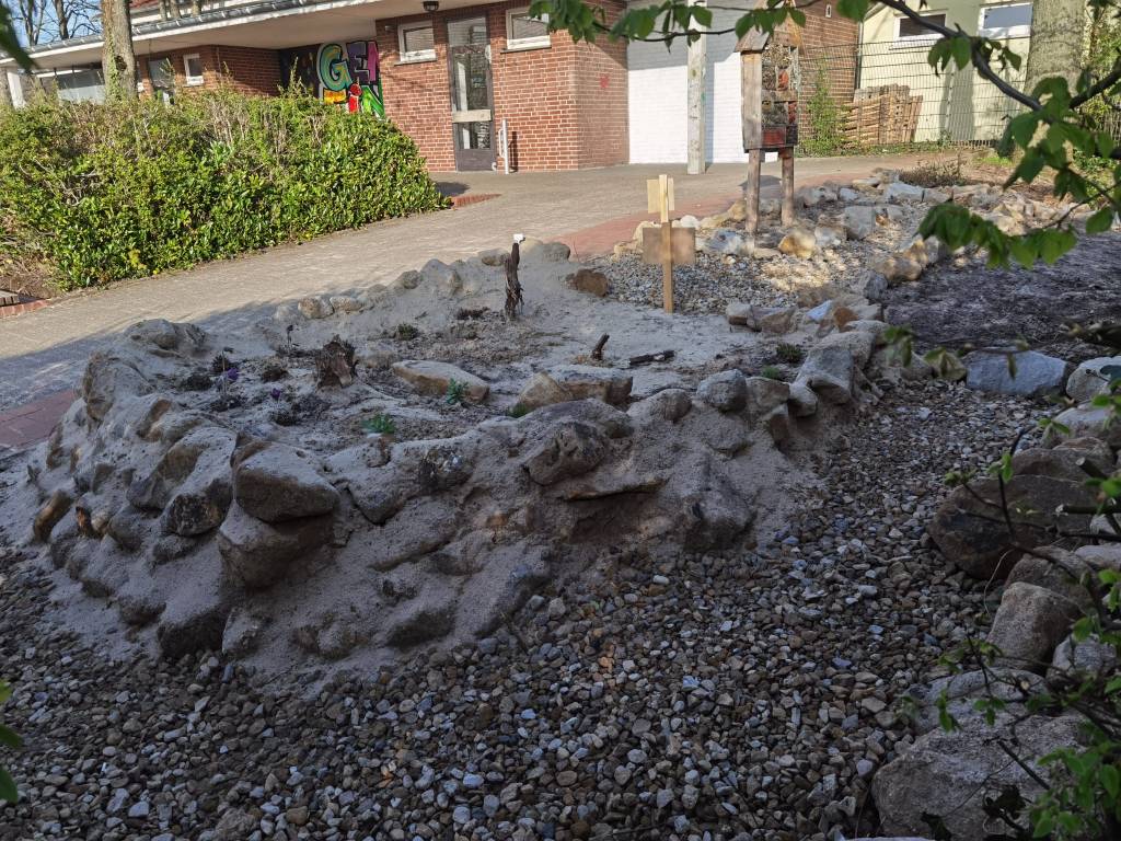Die Anne-Frank-Realschule in Greven verwandelte ein großes Hochbeet in einen Lebensraum für Wildbienen. Sträucher, die für Wildtiere nicht besonders nützlich sind, wurden entfernt, der bisherige Boden ausgehoben und anschließend alles mit Lehmhaltigen Sand aufgefüllt und verdichtet.