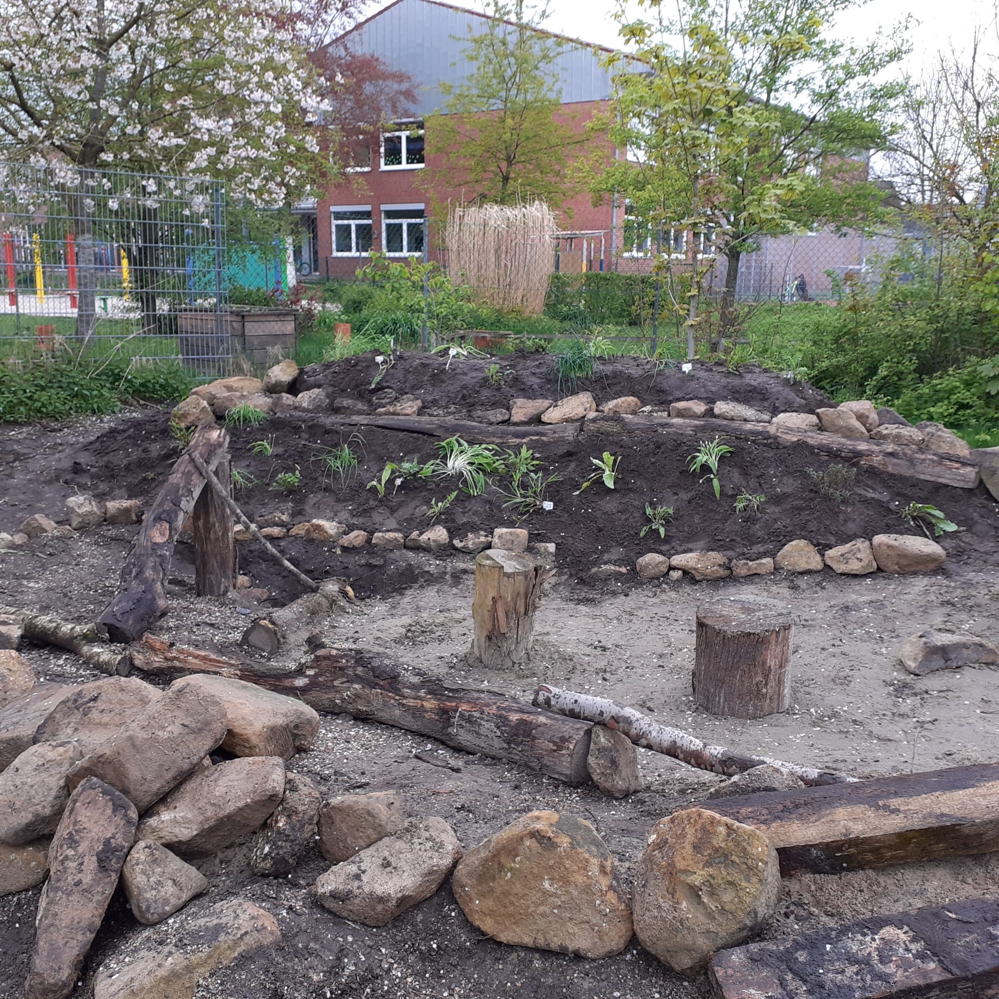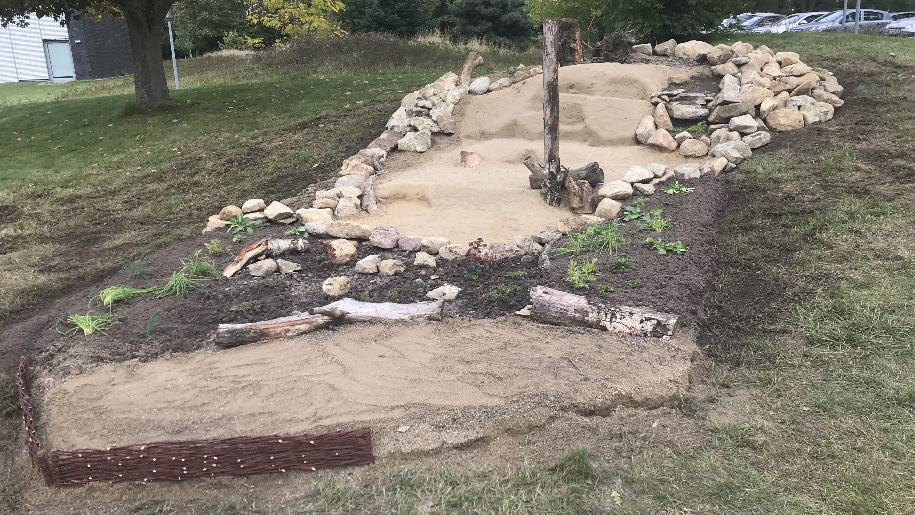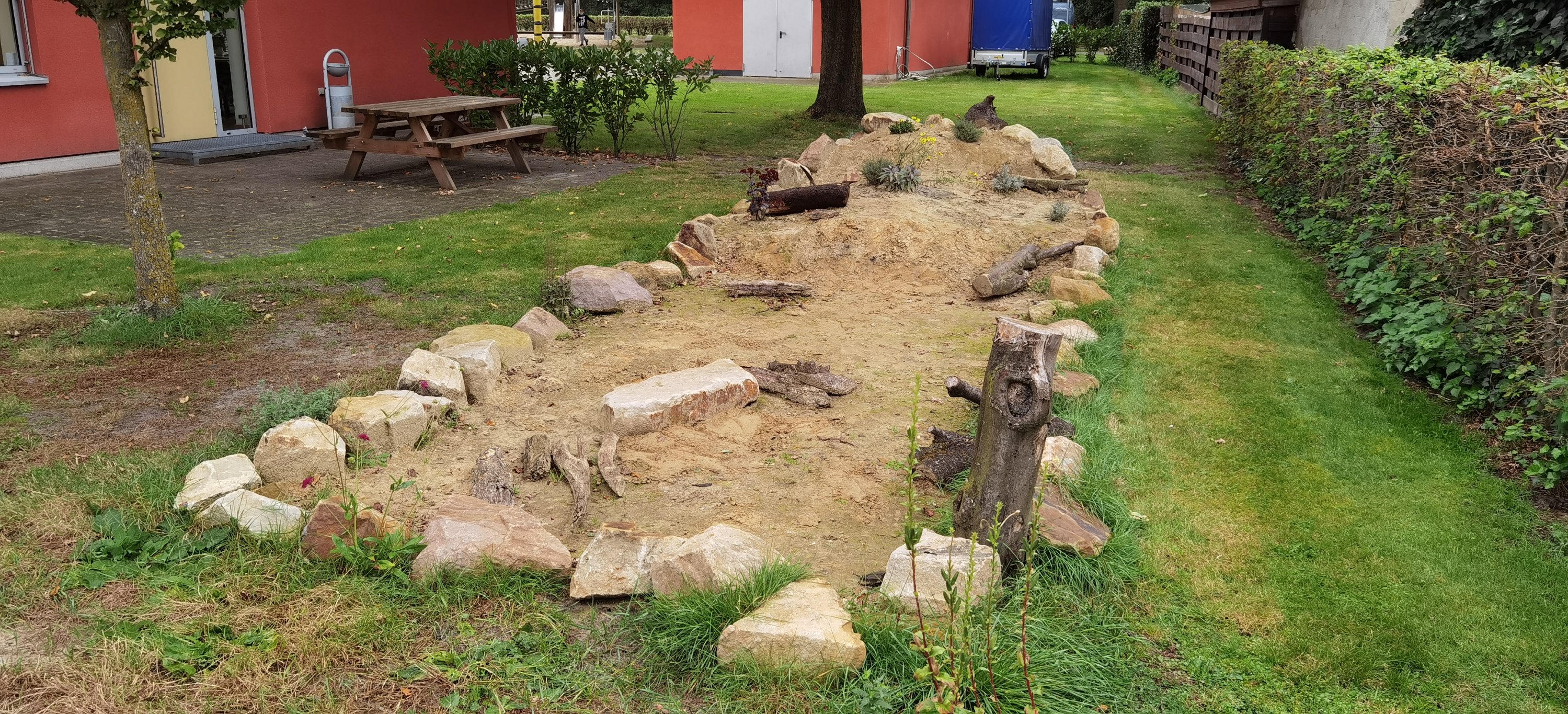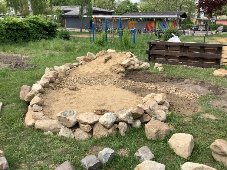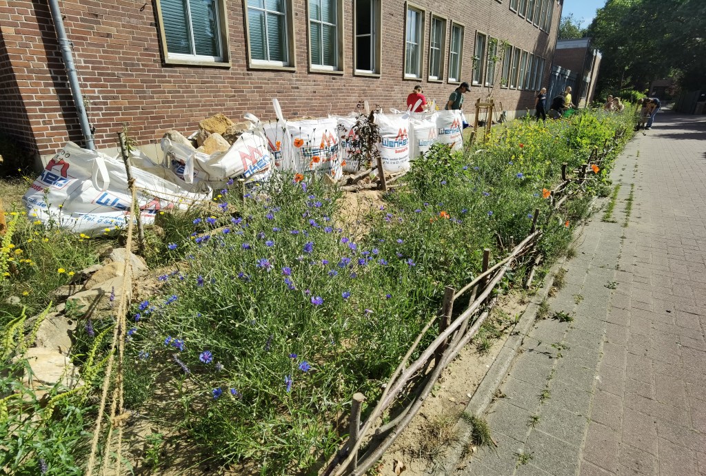 Die Anne-Frank-Realschule in Greven verwandelte ein großes Hochbeet in einen Lebensraum für Wildbienen. Sträucher, die für Wildtiere nicht besonders nützlich sind, wurden entfernt, der bisherige Boden ausgehoben und anschließend alles mit Lehmhaltigen Sand aufgefüllt und verdichtet.