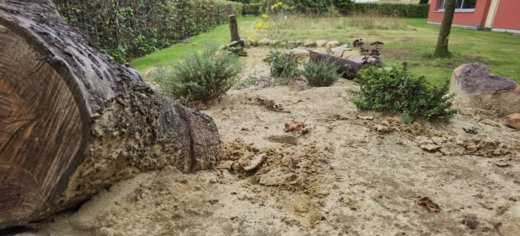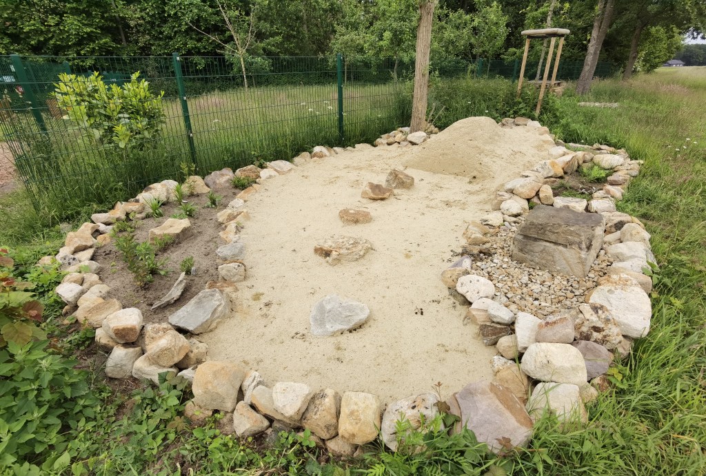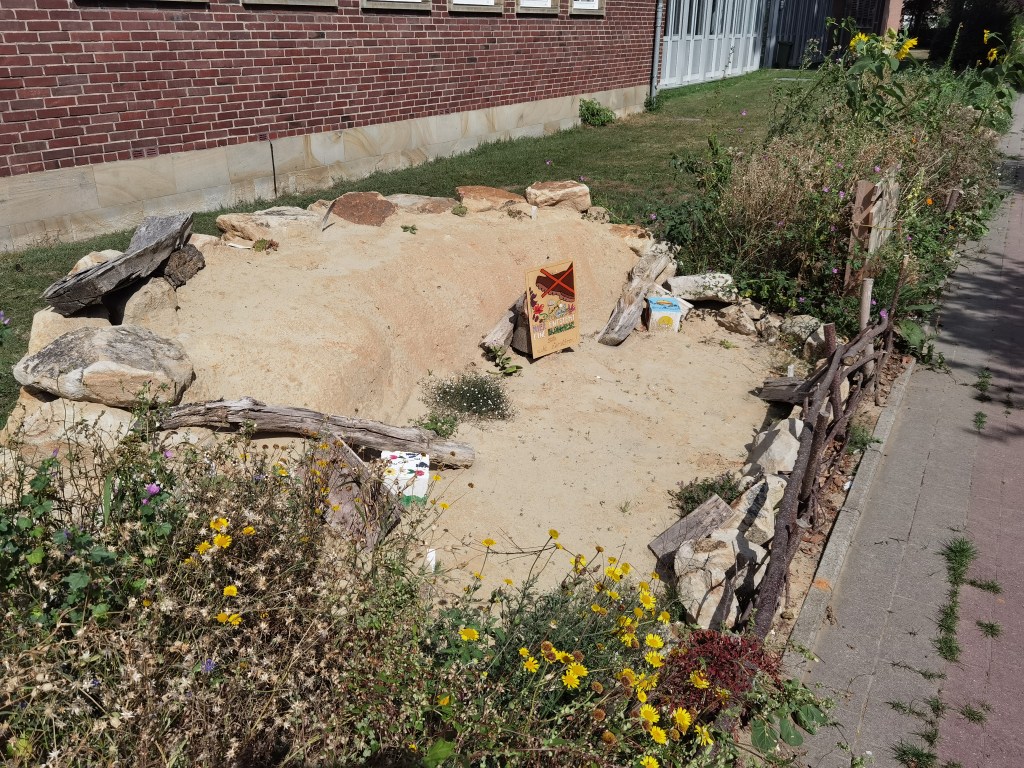 In den Sommerferien hat das InNature-Team gemeinsam mit der Wilhelm-Schule in Emsdetten mit der Anlage eines neuen Lebensraums für Wildbienen begonnen. Bei der Gestaltung des Wildbienenhabitats wurden verschiedene Sandarten eingesetzt, die in klar abgegrenzten Zonen angelegt sind. Ergänzt wurde der Lebensraum durch Sandsteine und Totholz, um möglichst vielfältige Nistmöglichkeiten zu schaffen. Mit diesem InNature waren wir sogar für den Insektenschützer-Wettbewerb 2025 nominiert.