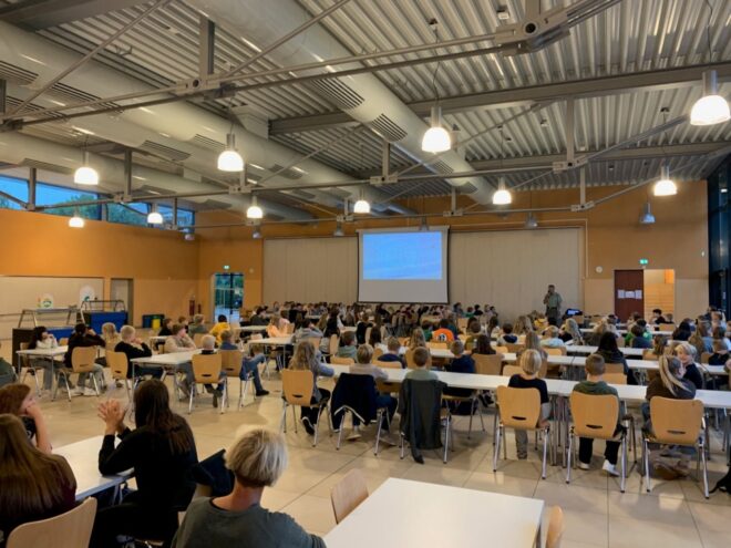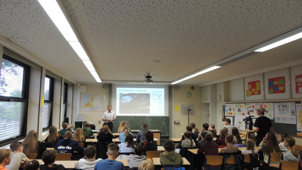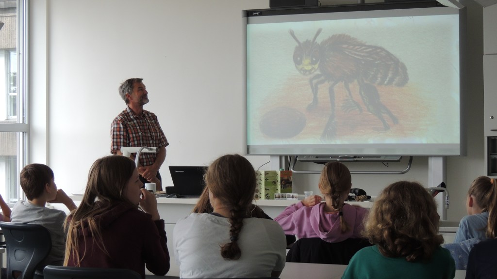 Unser Wildbienenexperte Werner Meyknecht war zu Gast im Städtischen Gymnasium Borghorst. Vor den Schüler*innen der Klassen 5, 6b, 6d und 10b hielt er einen spannenden Vortrag über die faszinierende Welt der Wildbienen. Die Aula war mucksmäuschenstill – so aufmerksam hörten die Jugendlichen zu.